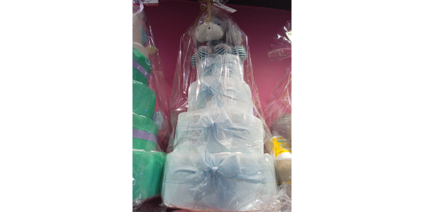 Tarta de pañales de cuatro pisos coronada por un peluche de un burrito. La tarta ha sido confeccionada con pañales Chelinos Nature talla 3.