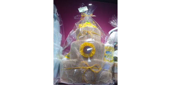 Tarta de pañales de cuatro pisos estilo primavera coronada por una lamparita de estrella. Incluye dos productos de Mitosyl: gel-champú y loción corporal. La tarta ha sido confeccionada con pañales Chelinos Nature talla 3.